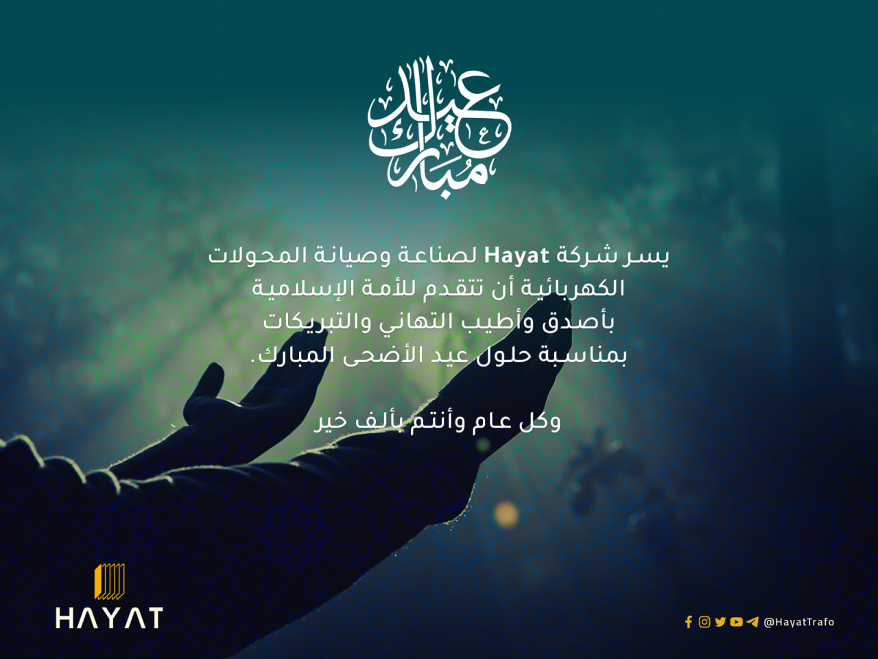 يسر شركة حياة Hayat لصناعة وصيانة المحولات الكهربائية أن تتقدم للأمة الإسلامية بأصدق وأطيب التهاني والتبريكات ...
